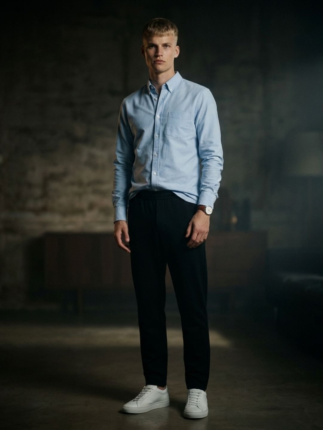 Uncuffed tapered joggers + fitted Oxford shirt (half-tucked) + white leather sneakers + minimal leather watch