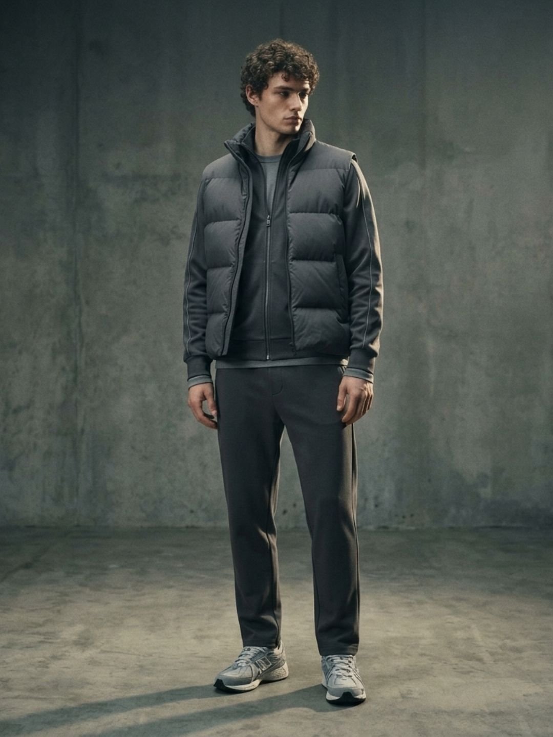 Uncuffed joggers (any neutral) + long-sleeve base layer + zip-up hoodie or track jacket + puffer vest + clean runners