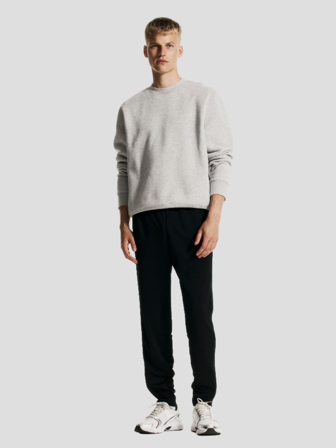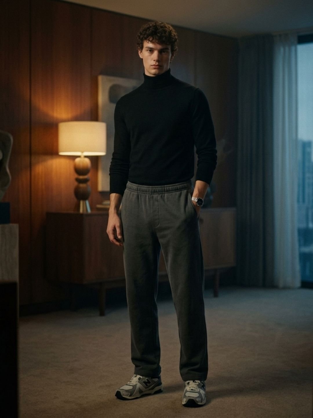 Grey uncuffed joggers + fitted black turtleneck + chunky sneakers (New Balance 550 or Nike Air Max 1) + minimal watch