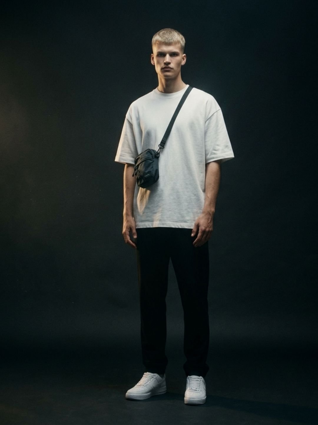 Uncuffed black joggers + white oversized tee + white low-top sneakers + small crossbody bag